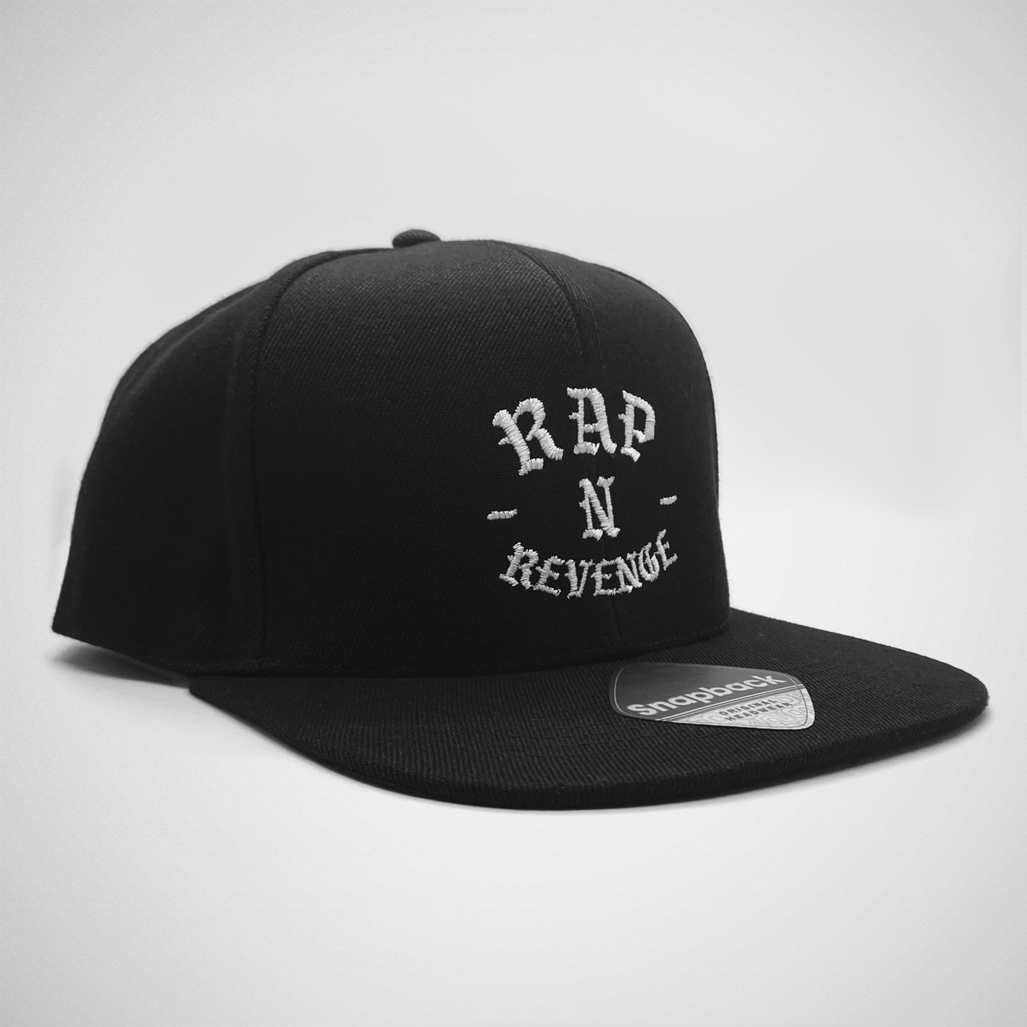 Casquette Snapback noir « Rap and Revenge » avec le logo « Rap and Revenge » brodé en blanc en face avant.