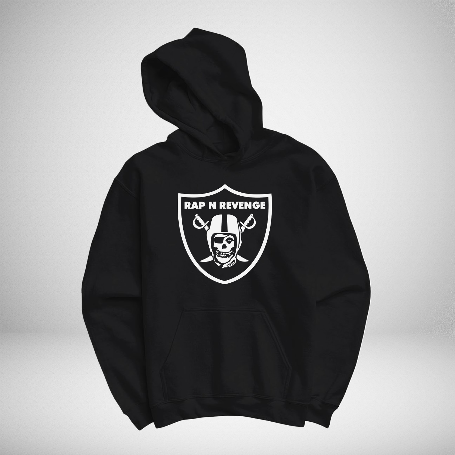 Sweat-shirt à capuche Rap and Raiders de couleur noir avec logo imprimée en blanc sur la face avant.