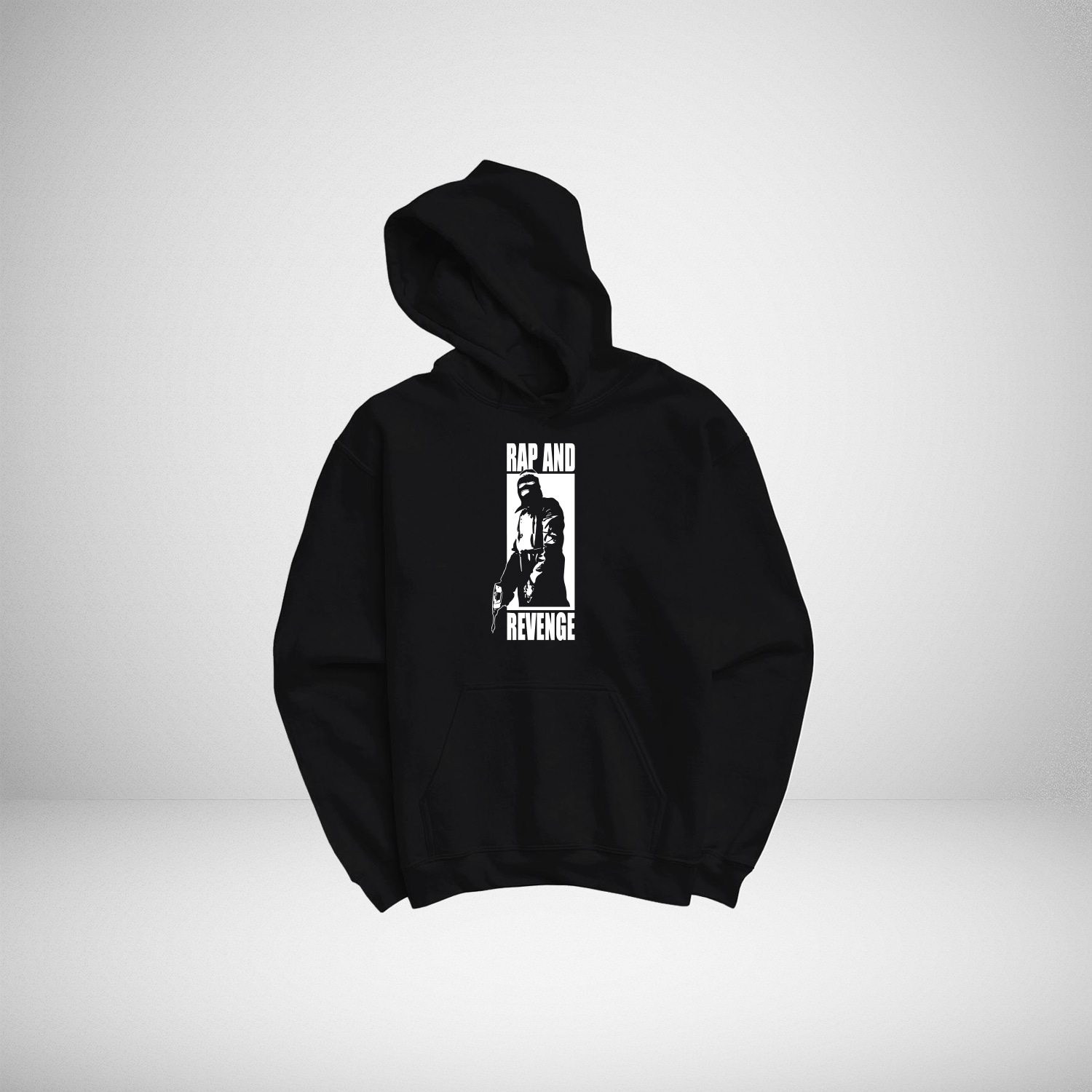 Sweat-shirt à capuche « Rap and Revenge » de couleur noir avec logo imprimée en blanc sur la face avant.